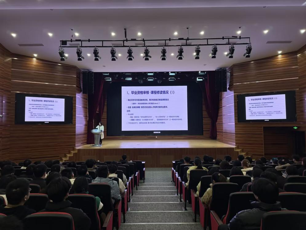 李蕊就课程修读情况自查及毕业设计相关要点展开宣讲。督促毕业生尽快开展课程修读情况自查,检查个人是否已达人才培养方案毕业要求。若存在修读异常情况,博彩交易所 教务科将对学生提供咨询和帮助。同时,李蕊对毕业设计流程与时间节点进行梳理,强调时间管理与任务规划的重要性,提醒学生了解每个环节的通过标准,禁止学术不端的行为。建议学生保持与指导老师的紧密沟通,按时完成学业目标顺利毕业。