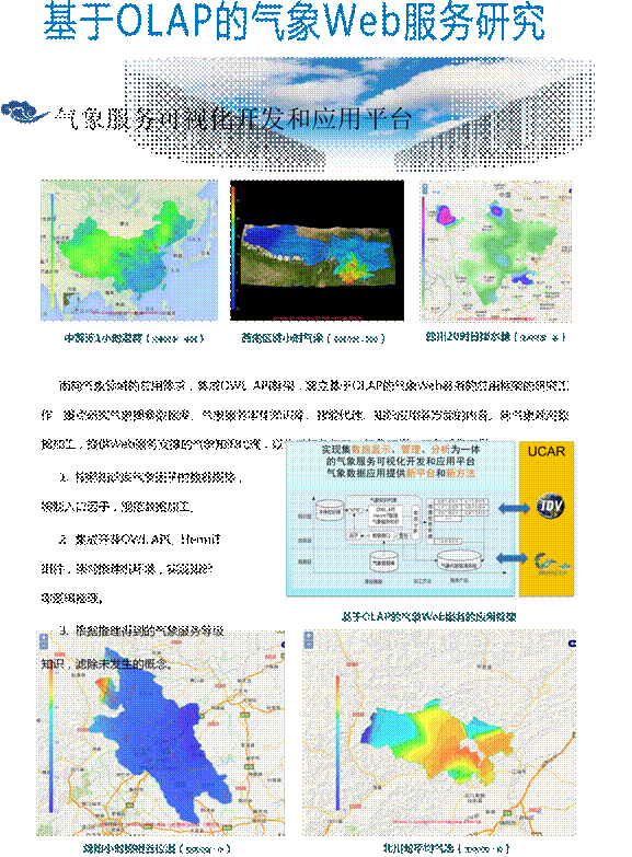 中心主要研究气象海量信息共享、气象数据集成与可视化、新一代气象软件工程开发技术、公共气象服务等气象信息技术,重点开展基于WebGIS的气象应用、气象数据加工、基于OLAP的气象Web服务、基于流程驱动的气象数据分发与共享等应用研发工作。