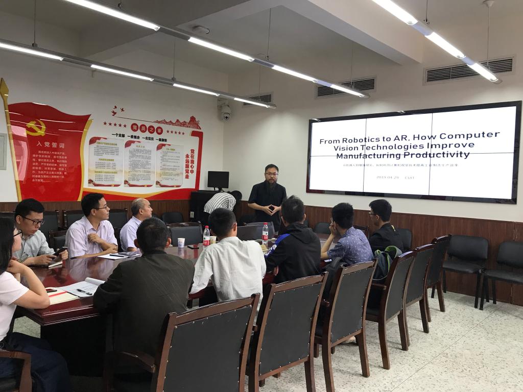 4月29日上午,DAQRI增强现实研究中心资深主管工程师周凯,在双中心B505会议室为在场师生做了一场题为“从机器人到增强现实,如何利用计算机视觉技术提高工业制造生产效率”的学术讲座。
