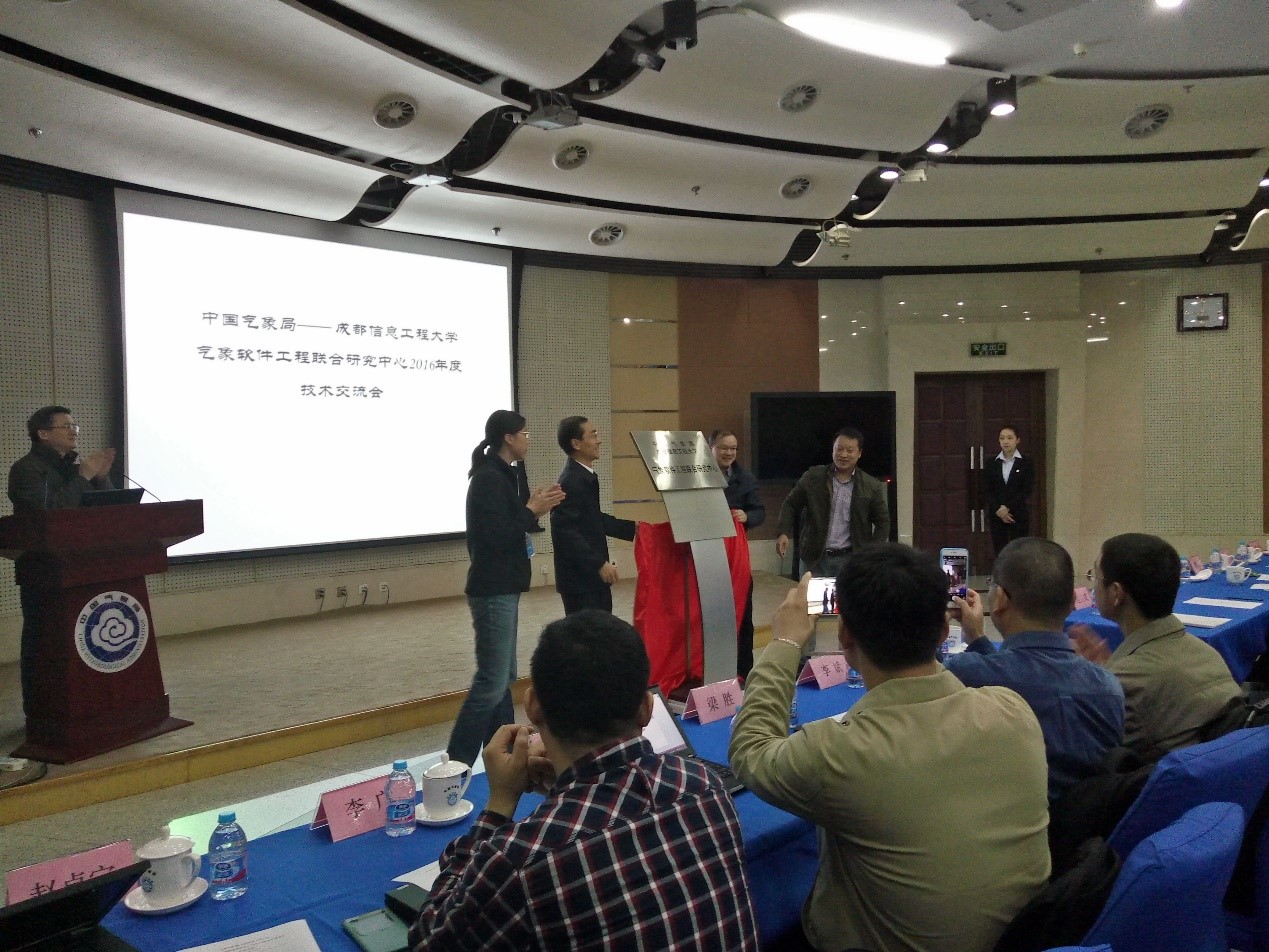 中国气象局科技与气候变化司副司长于玉斌,国家气象信息中心主任赵立成,国家气象信息中心副主任肖文明,国家气象信息中心系统工程室主任李湘,成都信息工程大学校长助理舒红平等领导受邀共同为气象软件工程联合研究中心举行挂牌仪式。仪式结束后,分别向联合研究中心新聘的联合单位主任委员李湘总工和舒红平教授颁发了聘书。
