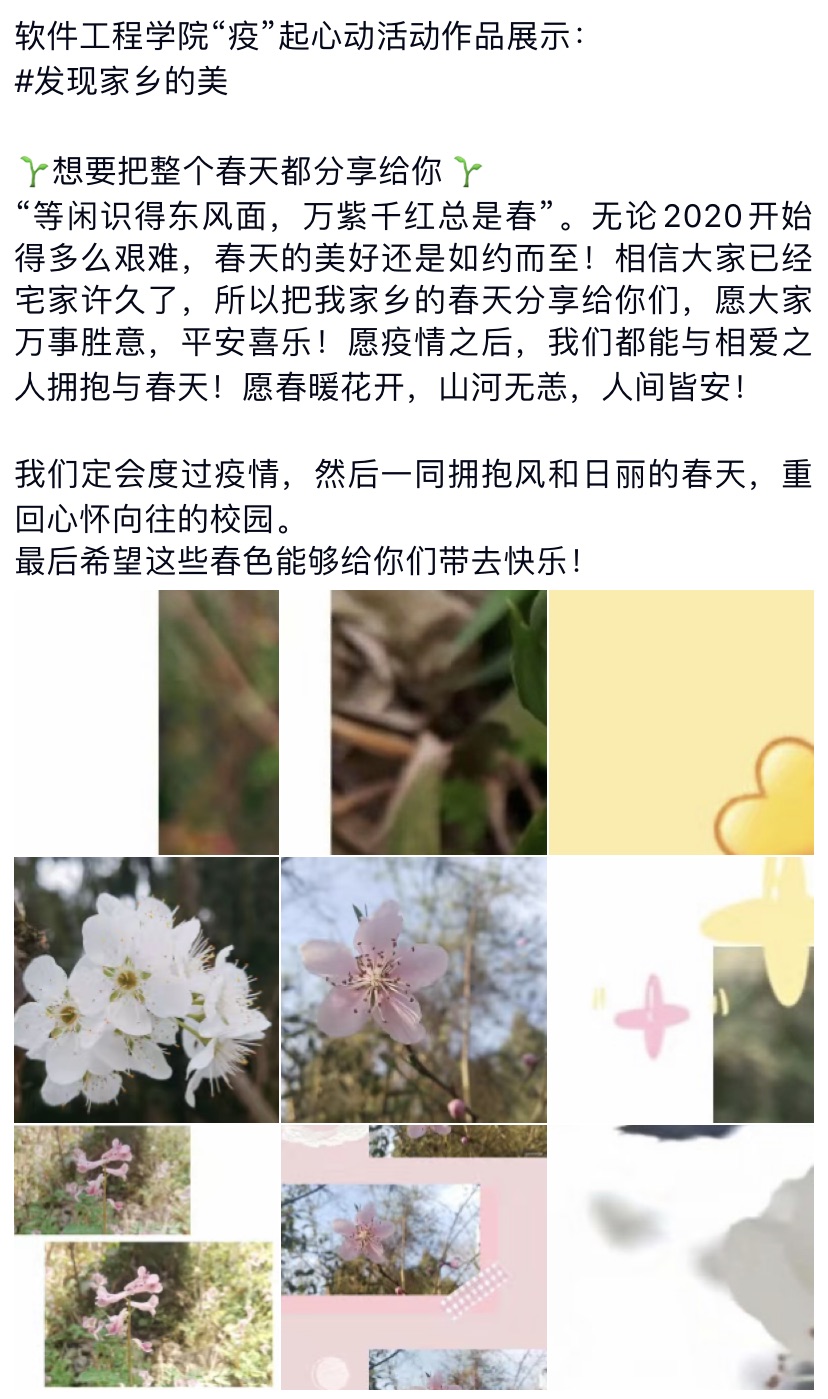 活动意在收集同学们周围的光和热,并且将其分享出来,以此来彼此传递自己身边的美好。作品通过空间说说的形式,带给同学们一种熟悉、温暖感。参与的同学们纷纷精心准备自己的作品,每一张图片,每一段话,都是给大家分享自己的生活,同时在疫情期间对彼此进行鼓励。传递爱与温暖是本次活动的目的,也希望疫情期间同学们能够收获属于自己的爱和温暖。
