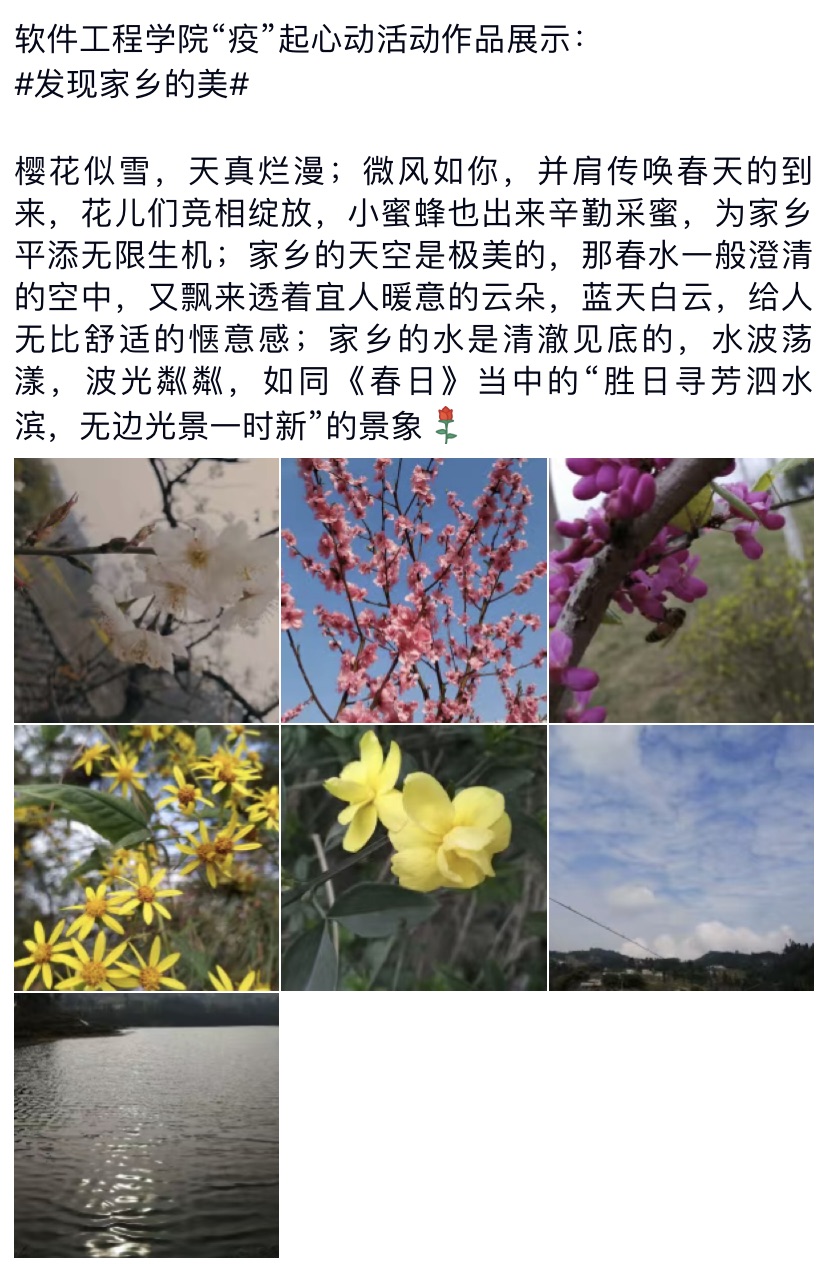 团委、学生会办公室组织开展“疫”起心动活动圆满结束,活动旨在开展以在线上投递“家有萌宠”、“发现家乡的美”、“温馨小故事”为主题的活动给在疫情期间待在家里的同学带来温暖。