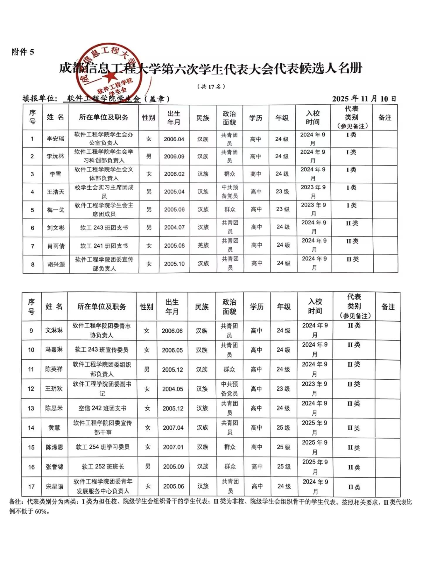 资格审查与遴选,确定 李安瑞 等 17 名同学为成都信息工程大学第六次学生代表大会代表人选(具体名单见附件)。