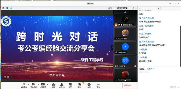 校友们分别从择考、考前心态、技巧分析等多方面进行分享,以“为什么要考公?”“不忘初心”“备考选调生的方法:除了刷题之外还有什么?”“搞清楚再考”为主题分别阐述了校友们对考公考编的理解,结合自身实际分享申论以及公文的写作技巧。学长学姐们勉励学弟学妹们要以社会为己任,坚定理想信念,调整好心态,戒骄戒躁、积极应考。要充分认识自己的不足,学会自我调解。线上进行了互动与答疑解惑,针对毕业班同学提出了各种问题,学长学姐们耐心解答并提出了针对性的建议。
