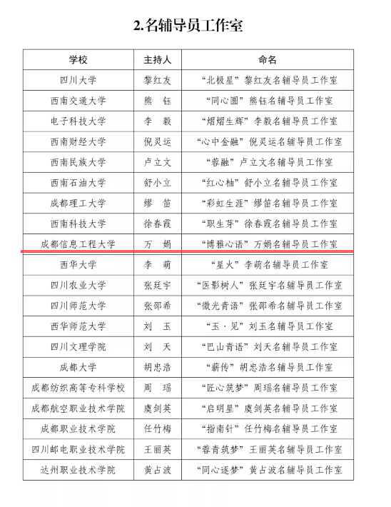近日,根据《中共四川省委教育工作委员会 四川省教育厅关于开展高校思想政治教育名师工作室建设工作的通知》(川教工委函[2021]117号),我校辅导员万娟经学校推荐,专家评审、省委教育工委和教育厅审核,确定为2021-2025第1批高校思想政治教育名师工作室——“博雅心语”名辅导员工作室主持人,将建设成立四川省高校思想政治教育名师工作室。