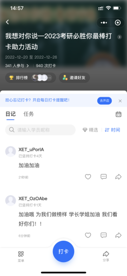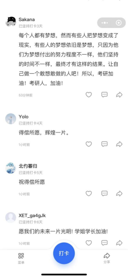 师生通过线上打卡的形式纷纷为考研学子带去暖心慰问和真挚祝福,为他们加油鼓劲、缓解焦虑、增强信心。