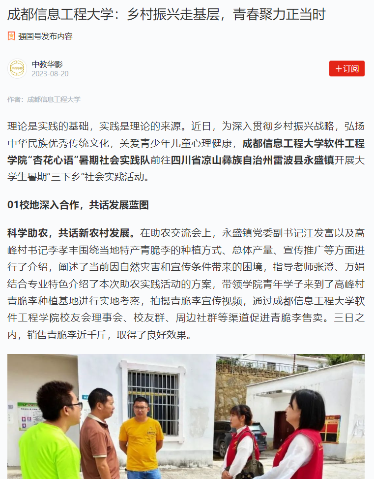 为深入贯彻落实习近平总书记给中国农业大学科技小院学生的重要回信精神以及总书记关于“三农”工作的重要论述,引领学生心系家国,厚植爱农助农兴农情怀,切实将课堂学习与乡村实践紧密结合,今年7月,博彩交易所“杏花心语”大学生暑期社会实践队(四川省省级重点团队),在指导老师张澄、万娟的带领下前往雷波县永盛镇开展大学生暑期“三下乡”社会实践活动,助力乡村振兴。活动获得学习强国平台报道。