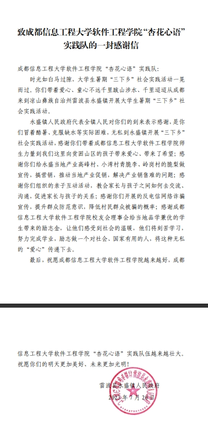 活动结束后,“杏花心语”实践队收到当地政府发来的感谢信,对实践队在助力当地农产品销售、防诈反诈宣传以及青少年心理健康教育等方面提供的帮助表示衷心感谢。本次活动还得到了中青网、雷波视界、共青团雷波县委微信公众号等多家媒体平台的报道。博彩交易所平台推荐