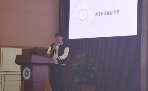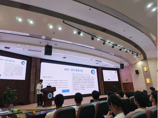 的优质师资、专用场地与教学资源,旨在为参赛学生提供系统性的高水平训练。这里不仅是学生将理论知识转化为实践能力的练兵场,更是学生提升综合素质的重要基地。宣讲会在ACM实验室教练黄健老师热情洋溢的发言中拉开帷幕。他回顾了实验室从初创至今的发展历程,强调了队员们在训练与比赛中的坚持与付出。队员们获得的每一块奖牌的背后,都是无数次的挑战与突破。他鼓励新生在大学期间明确目标、珍惜时光、勇于拼搏,为大学生活书写精彩篇章。
