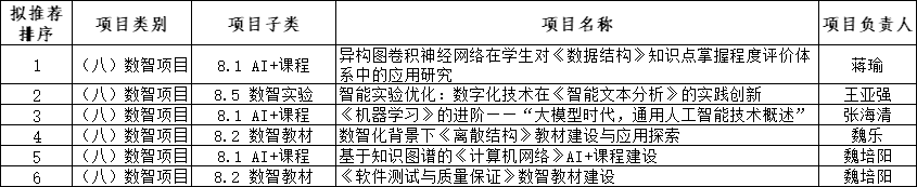 根据学校下发《关于开展学校2024年本科教学工程项目“数智项目”申报工作的通知(教务发〔2024〕12号)》的文件要求,经教师本人自主申请,博彩交易所 教学指导委员会代表对申报项目开展双盲评审排序,现将结果公示如下: