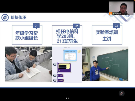 李毅同学从一个大四学长的角度,向大家讲述了学习、社会工作、支教、生活娱乐之间的关系,他告诫广大同学尤其是学生党员要珍惜宝贵时光,不要让日子混了自己,不断提高自身素质,用自身的求学经历激励广大党员要努力上进,用自身的支教经历告诉广大党员要学会相信组织,成为一个对社会有贡献的人。黄熠昕同学从技术方面的角度,向大家讲述了学习、生活娱乐、比赛之间的关系,通过自身不断的努力,参加各种知名大赛,真正地做到了不仅要精于理论,更要勤于实践,不断实践铸就精彩的大学生涯。何俊湫同学用自身参加的志愿活动、三下乡等告诉我们如何去做个有用的人,什么是作为一个党员的初心使命。