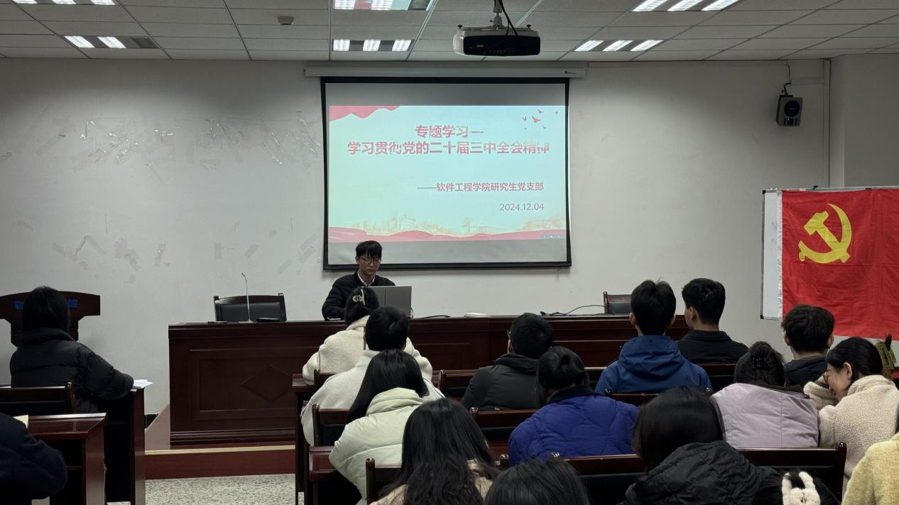 2024年12月4日,博彩交易所研究生党支部在信达楼A502进行对党的二十届三中全会精神的专题学习,党员龙添辉同志组织全体党员深入学习贯彻习近平总书记关于全面深化改革的一系列新思想、新观点、新论断和党的二十届三中全会精神。