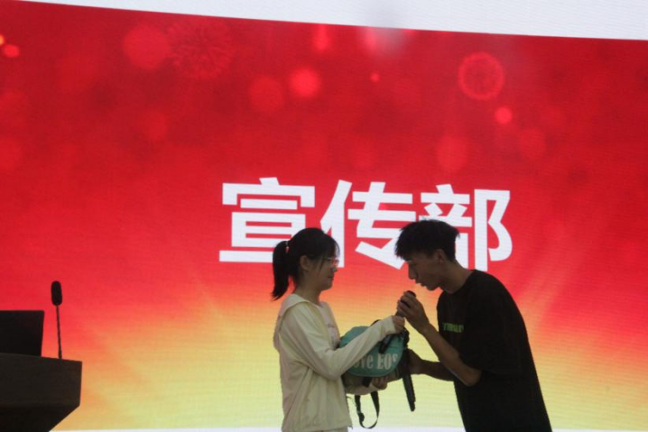 在朗朗的团歌声中,典礼拉开了序幕,团歌结束后,主持人播放宣传部制作的学年工作生活回顾视频,视频里记载了各部门的点点滴滴,包含了对继任部长们的期望和对所有部员的美好寄语。“传家宝”交接仪式、聘书颁发环节、各部门合照留影,每个环节既是对于一年工作的交接与肯定,又饱含各部门深厚的情谊。