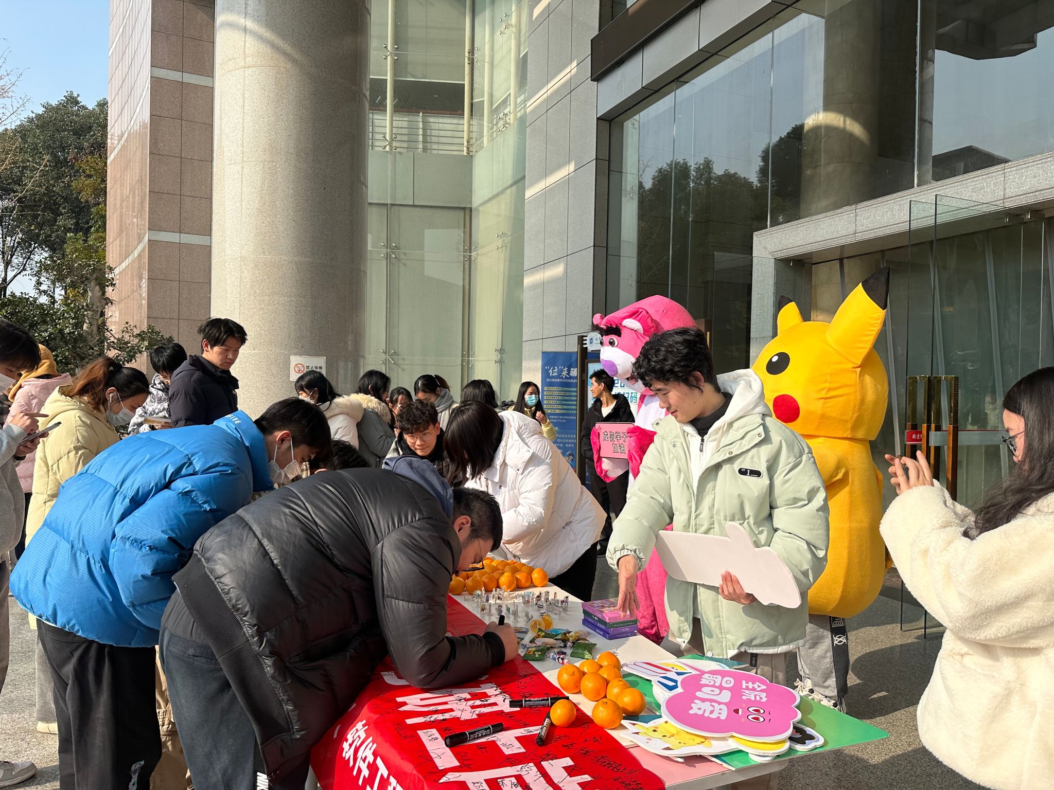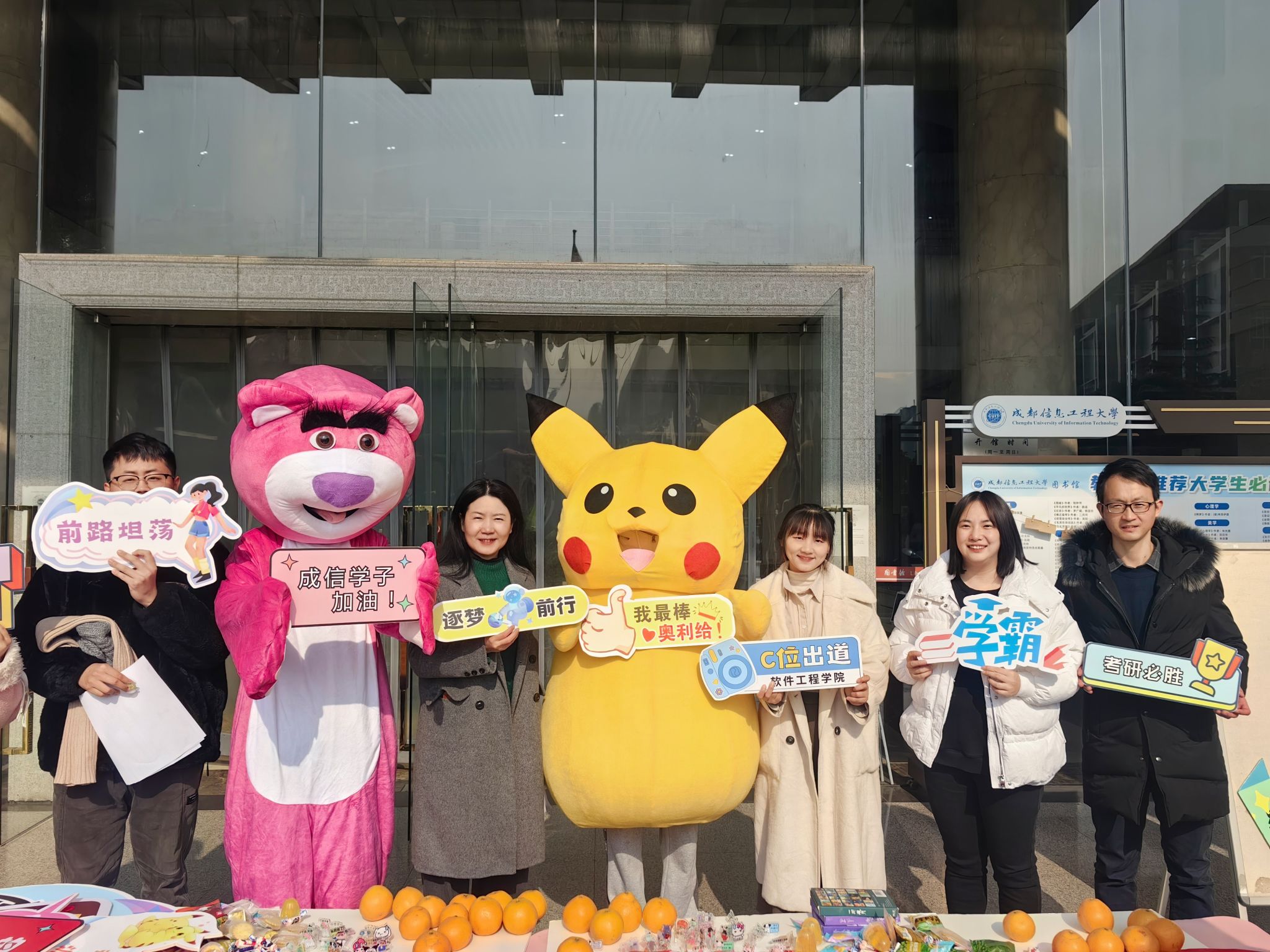 12月19日,博彩交易所“博雅心语”名辅导员工作室、团委在图书馆门口举办了“考研抱抱”活动。现场有可可爱爱草莓熊和皮卡丘,有寓意“大吉大利”的桔子,有写上祝福话语的明信片,有可以写下心愿的横幅...
