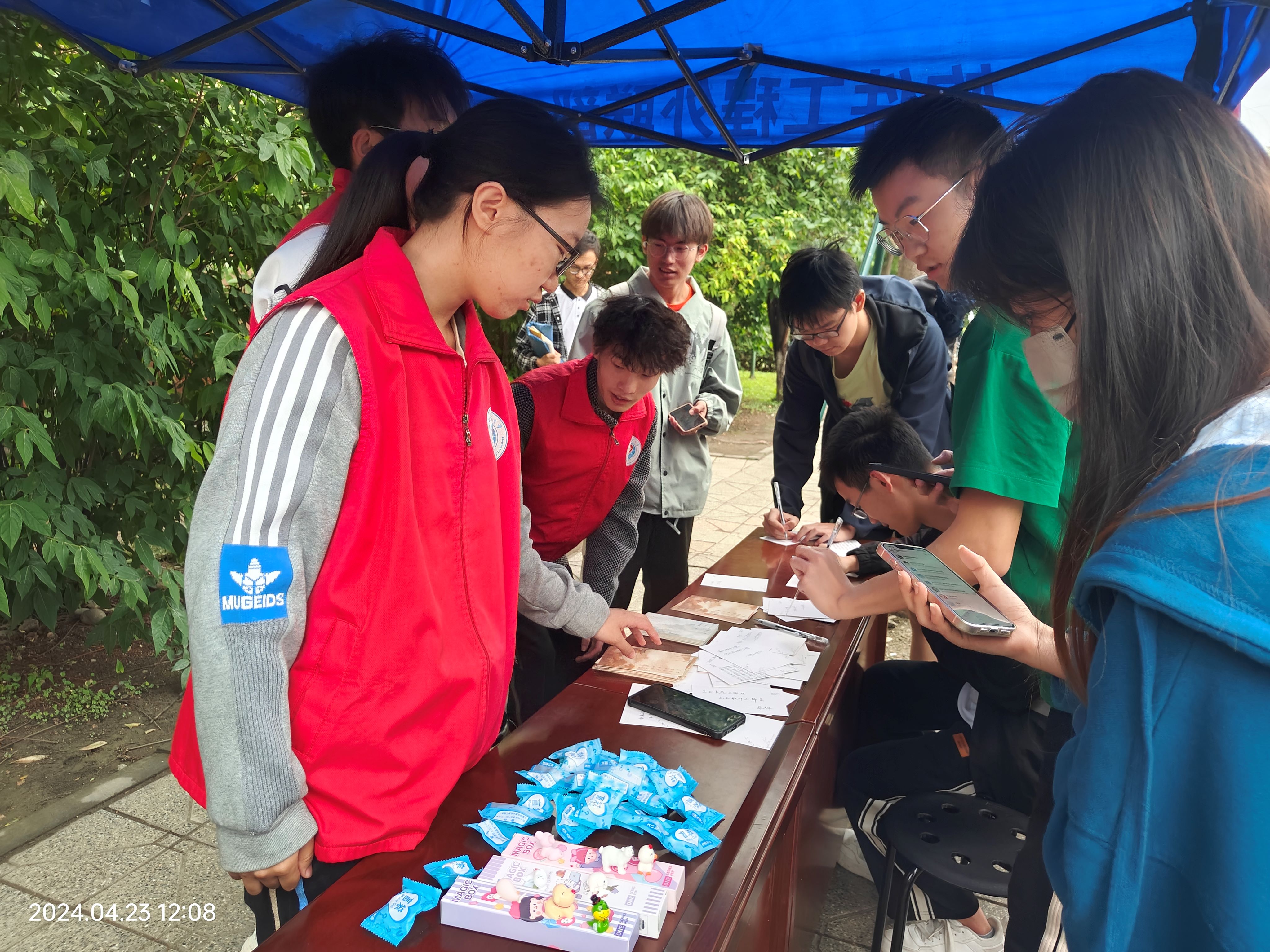 活动前期,志愿者们进行合理分工排班,并于提前将帐篷,桌椅等物资搬至13栋宿舍旁。活动当天,志愿者们早早地来到活动现场,布置起充满书香气息的场地。他们邀请同学们在明信片上写下自己希望分享的书籍及阅读感悟,并倡导大家参与为期一周的阅读打卡,以此方式推动阅读的传播。活动现场,同学们热情高涨,纷纷拿起笔在明信片上写下自己心爱的书籍美句和从书中获得的感悟。有的同学选择经典名著;有的同学则偏爱流行畅销书,每一句感悟都充满对书籍的热爱和对知识的渴望。