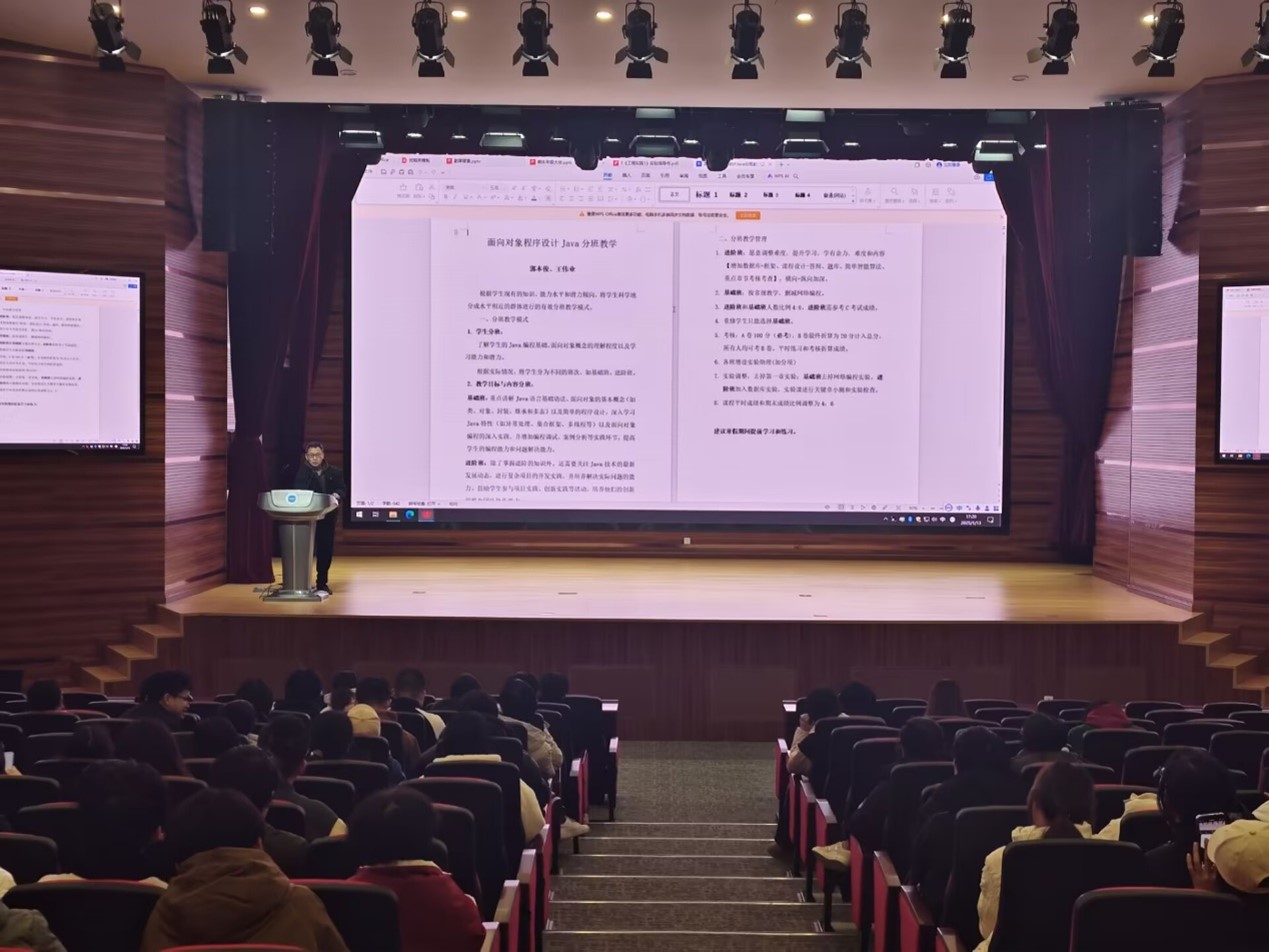 最后,郭本俊老师为同学们介绍了《面向对象程序设计Java》课程的分班教学安排。郭老师详细讲解了课程的教学大纲和学习要求,鼓励大家在寒假期间提前进行学习和练习,通过不断的实践巩固所学知识,为下学期的课程打下坚实基础,帮助同学们更好地掌握Java编程语言及面向对象编程的核心技能。